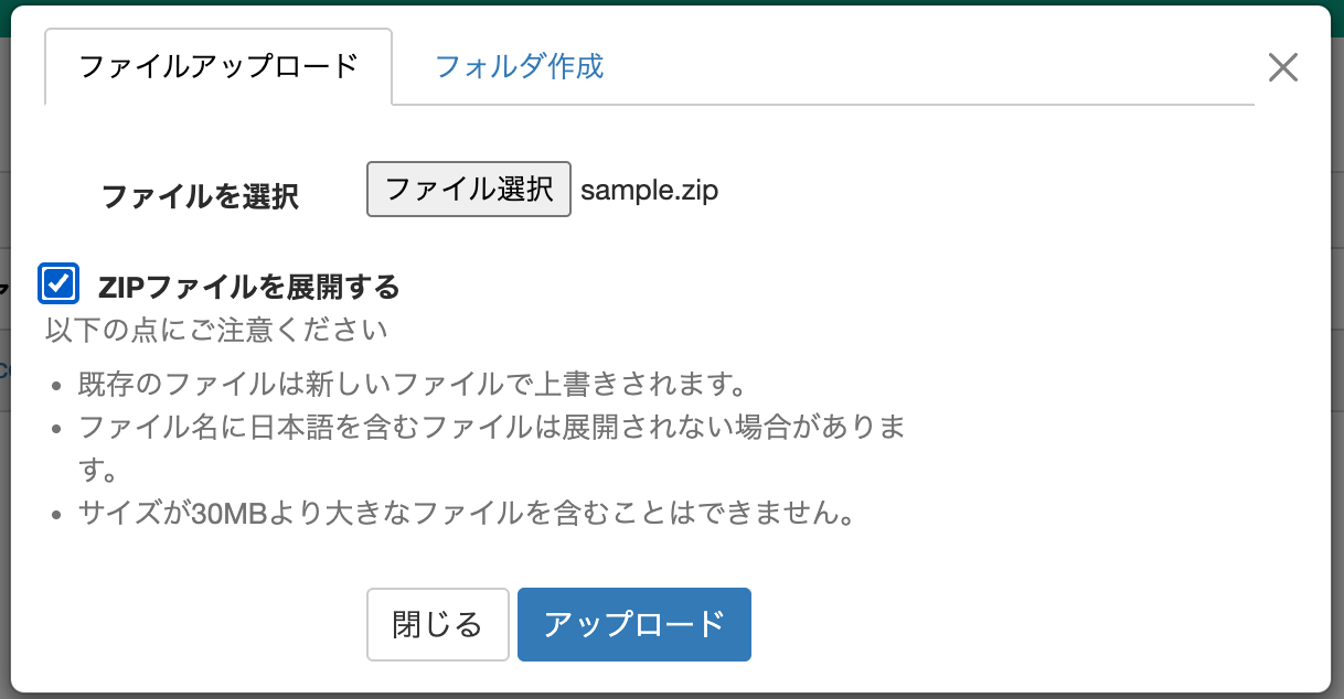.netのファイルマネージャーは単純なファイルアップロードだけでなく、zipファイルをアップした際に「zipファイルを展開する」にチェックを入れてアップロードすると、アップ完了後にzipファイルを解凍、展開をしてくれます。